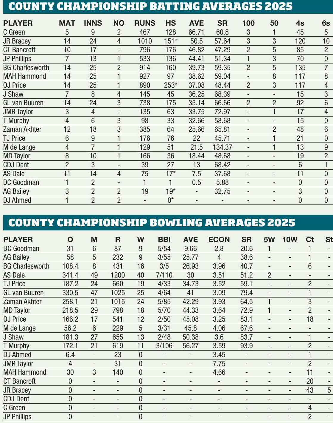 FORMED: 1871 HOME GROUND: Seat Unique Stadium, Bristol CAPTAIN(S): Cameron Bancroft (CC), TBC (ODC), Liv Daniels (Women) HEAD COACH: Mark Alleyne 2025 RESULTS: CC2: 6/8; ODC: quarter-final; T20: 7/9 (South Group; WODC: 5/10 (L2); WT20: 5/5 (South Group L2); WCCT20: first round HONOURS: Gillette/NatWest/C&G/FP Trophy: (5) 1973, 1999, 2000, 2003, 2004; Benson & Hedges Cup: (3) 1977, 1999, 2000; Pro40/National League/CB40/YB40/ODC: (2) 2000, 2015; T20 Cup: 2024