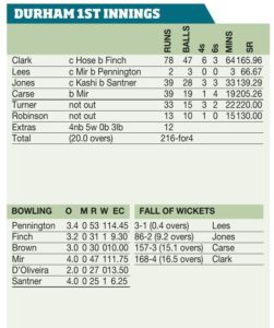 June 30, New Road, Worcester Durham 216-4 Rapids 112-3 Match tied Toss: Rapids, who elected to field WORCESTERSHIRE Rapids face a...