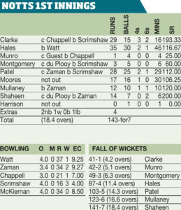 Results EDGBASTON, JUNE 3 Nottinghamshire Outlaws 214-3 (Clarke 89*, Munro 87); Birmingham Bears 203-9 (Hain 97*, Afridi 3-39). Outlaws won by...