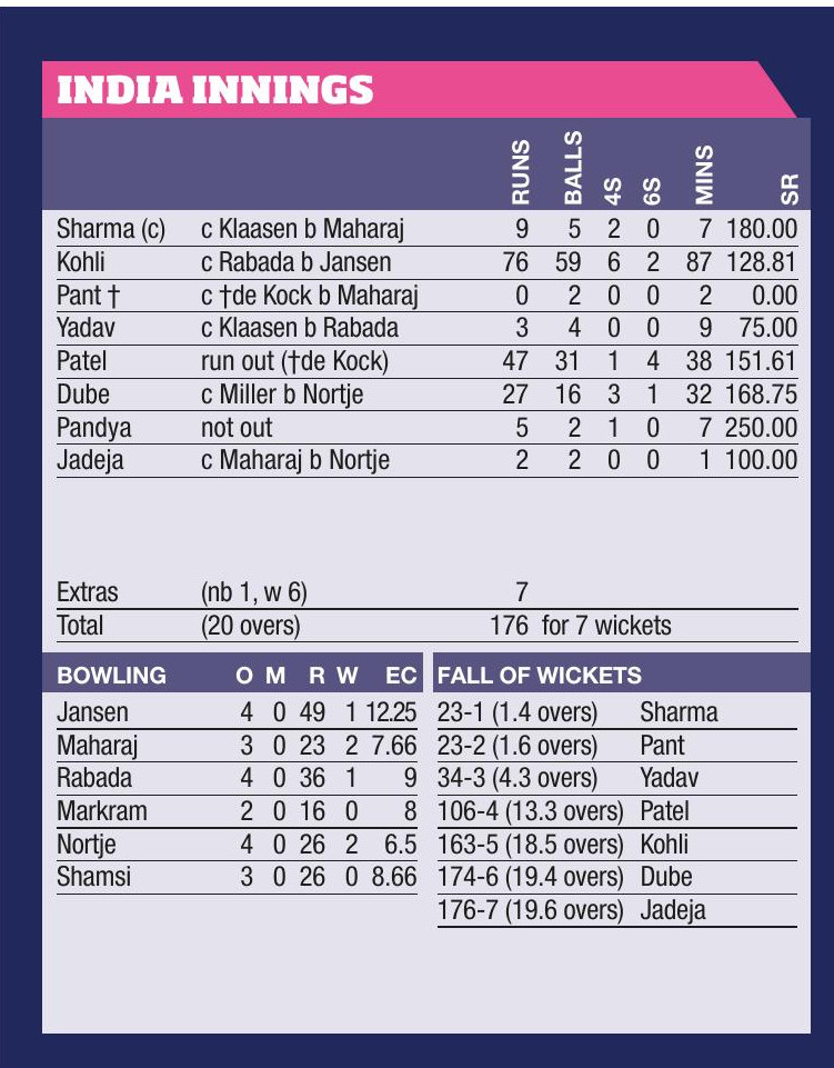 India 176-7 (Kohli 76, Patel 47, Maharaj 2-23, Nortje 2-26) South Africa 169-8 (Klaasen 52, de Kock 39, Pandya 3-20, Singh 2-20, Bumrah 2-18)