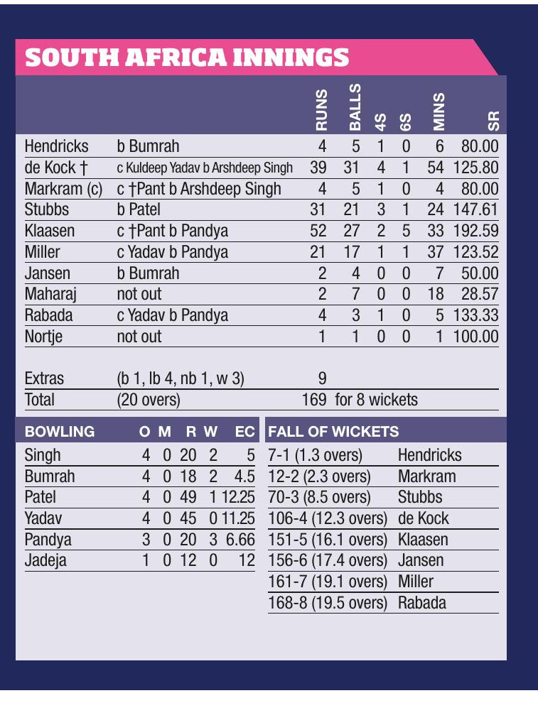 Heinrich Klaasen’s brutal half century almost took his side home in a tense finale, with good support from Quinton de Kock, Tristan Stubbs and David Miller, but the Indian pacers held their nerve and bowled brilliantly in the last five overs after their spinners had been harshly dealt with, in stark contrast to the semi-final.