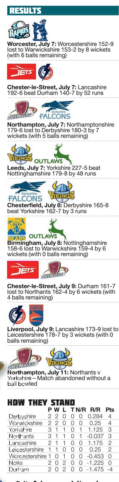 NORTH ROUND-UP By James Andrew DERBYSHIRE Falcons are the early pace-setters in the T20 North Group thanks to two wins in...