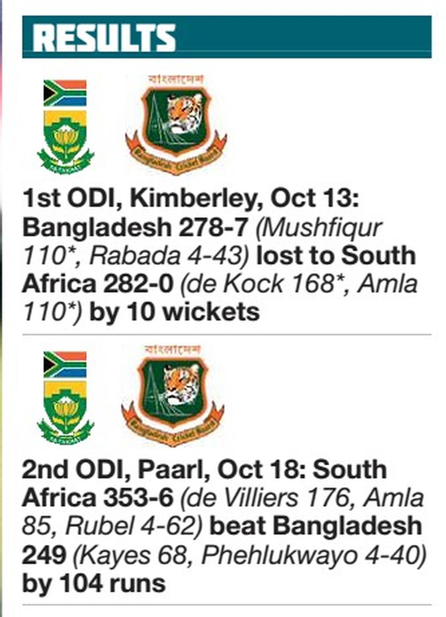 SOUTH AFRICA vBANGLADESH ODI ROUND-UP By Adam Ellis Stunning: South Africa’s AB de Villiers hit a wonderful 176 off just 104...