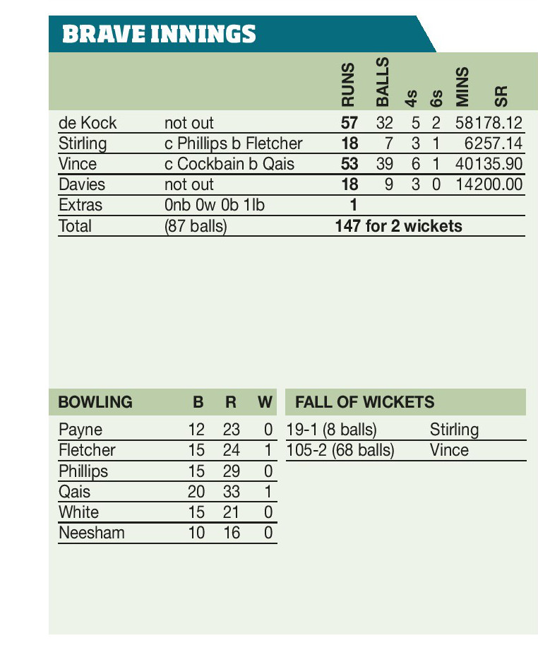 SOUTHERN Brave eased to a third win in four Hundred matches to move to the top of the men’s table on Wednesday with skipper James Vince and the in-form Quinton de Kock inspiring the south coast side to an eight-wicket win thus ending Welsh Fire’s finals aspirations.