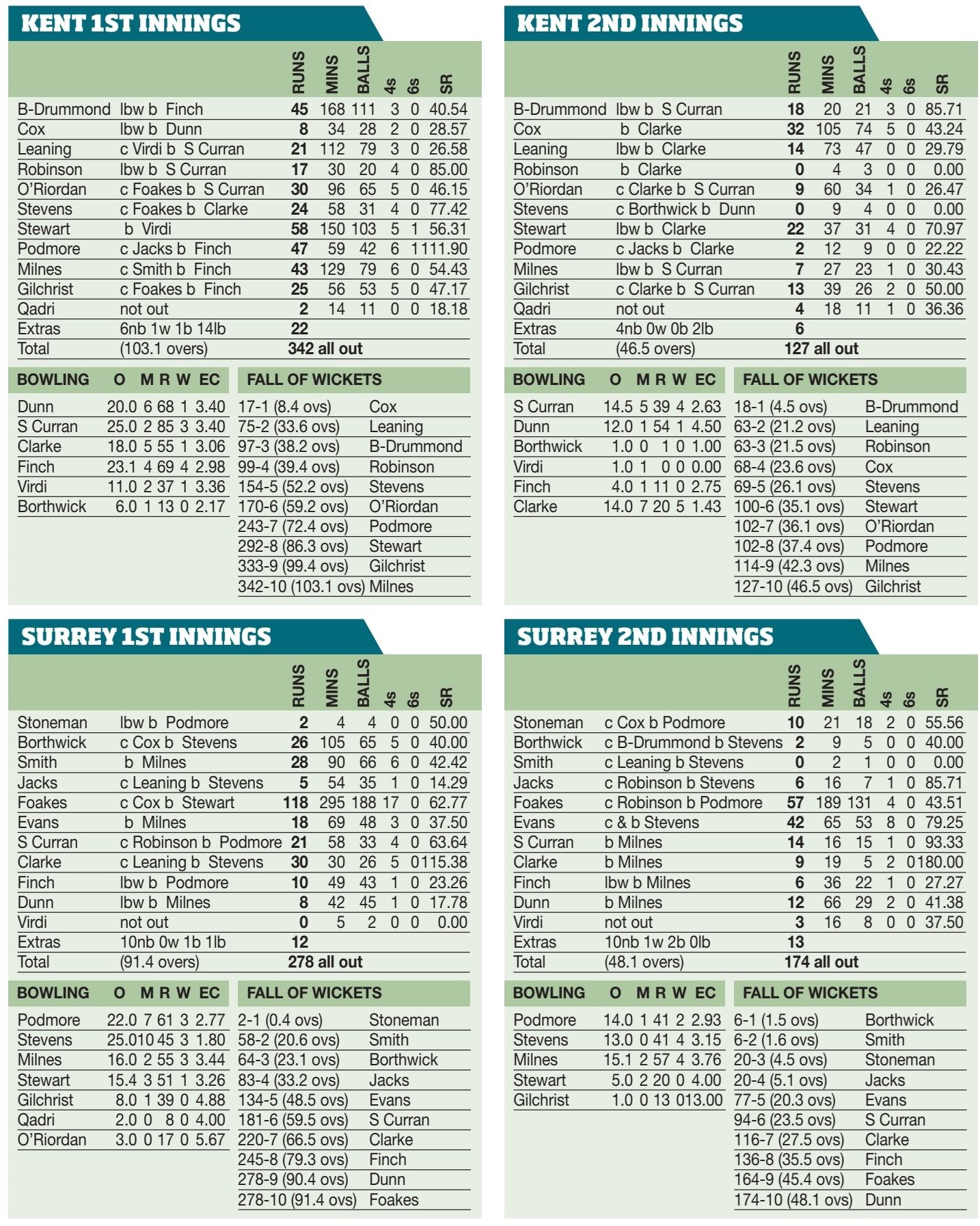 Surrey 278 (Foakes 118, Stevens 3-45) & 174 (Foakes 57, Stevens 4-41, Milnes 4-57) Kent 342 (Stewart 58, Finch 4-69) & 127 (Cox 32, S Curran 4-39)