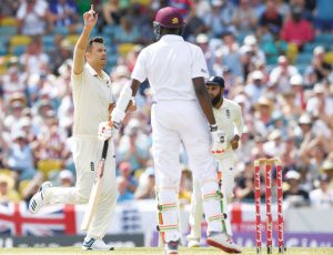 By Rory Dollard reports from Barbados High five: Jimmy Anderson salutes the capture of his fifth wicket as Alzarri Joseph is...