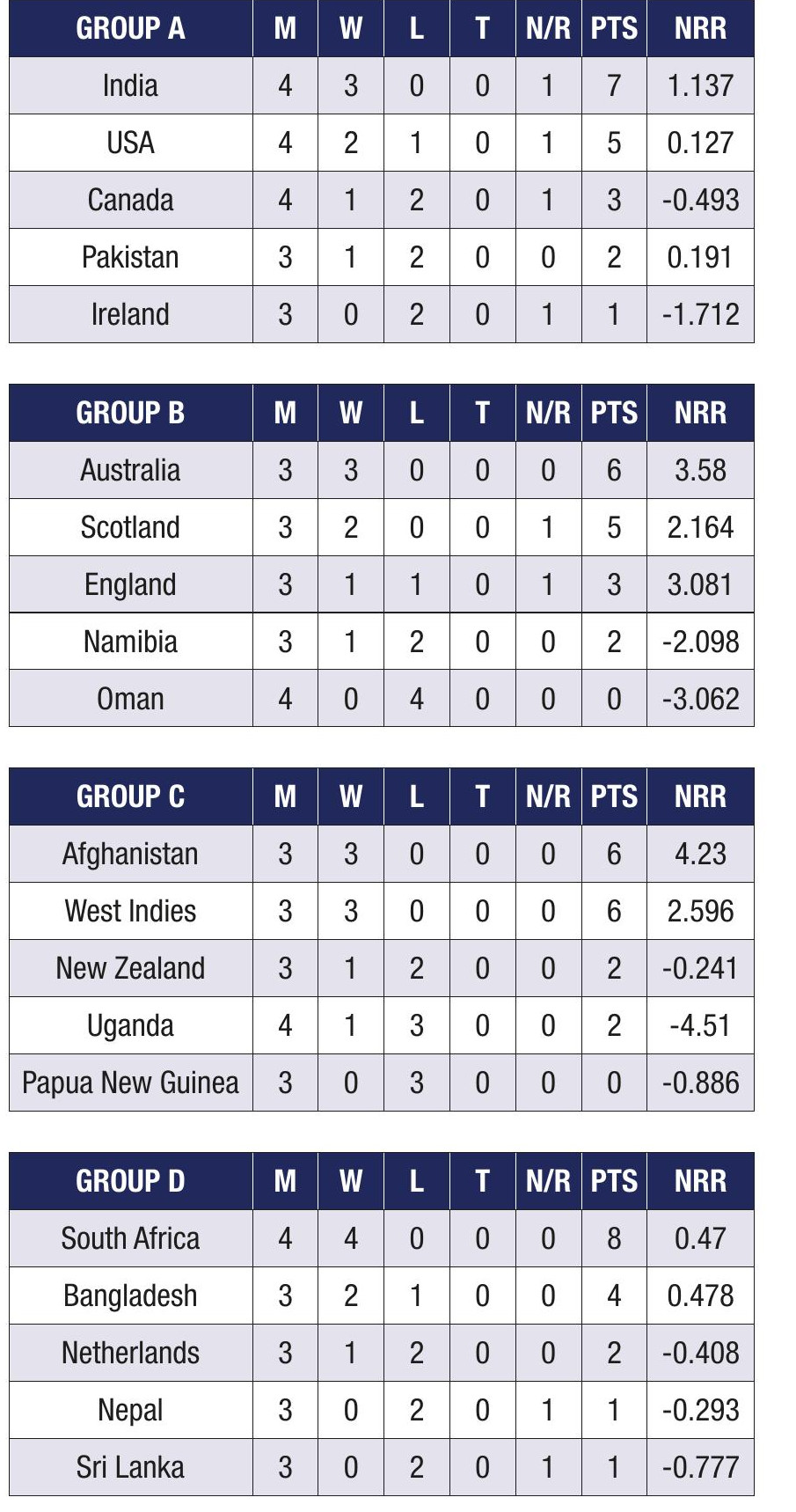 T20 WORLD CUP TABLES