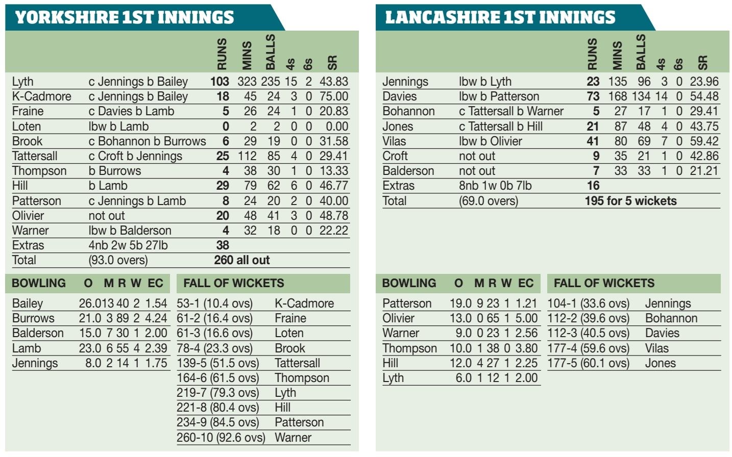 By Paul Edwards August 22-25, Emerald Headingley, Leeds Yorkshire 260 (Lyth 103, Hill 29) (Lamb 4-55, Bailey 2-40) Lancashire 195-5 (Davies...