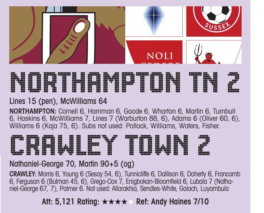 STAR MAN SHAUN McWILLIAMS Northampton CRAWLEY Town manager Gabriele Cioffihailed their “never-say-die attitude” after they forced a stoppagetime own goal to...