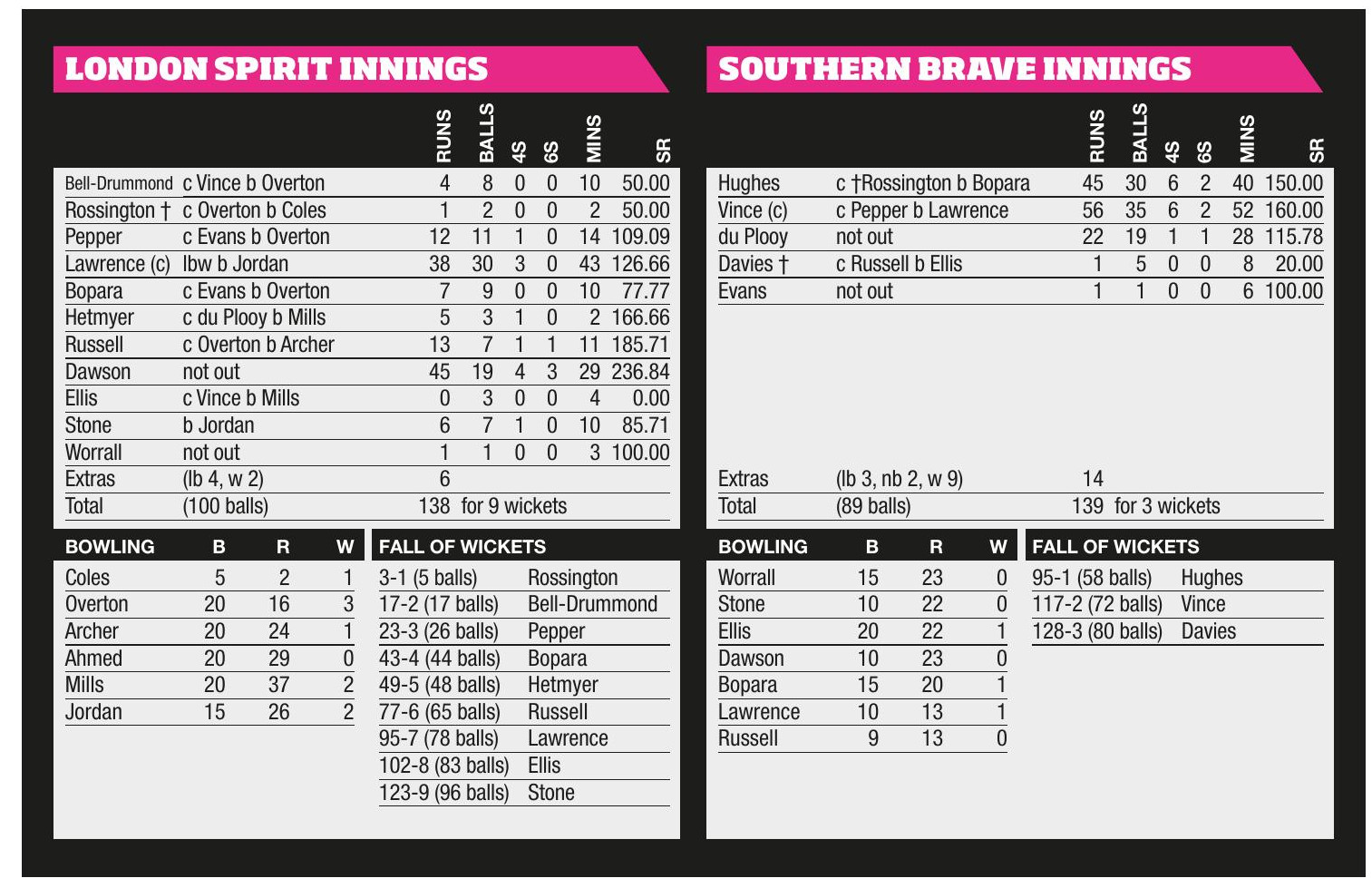 August 16, Trent Bridge, Nottingham Southern Brave Men 140-4Trent Rockets Men 145-6 Trent Rockets Men won by 4 wickets Toss: Trent...