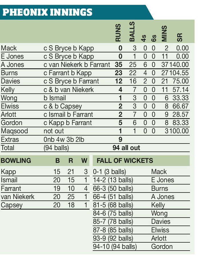 Phoenix appeared to be cruising at 66 for two at the halfway point before Kapp’s three for 21 and Tash Farrant’s 4-10 – the best figures of the Hundred so far – turned the ma...